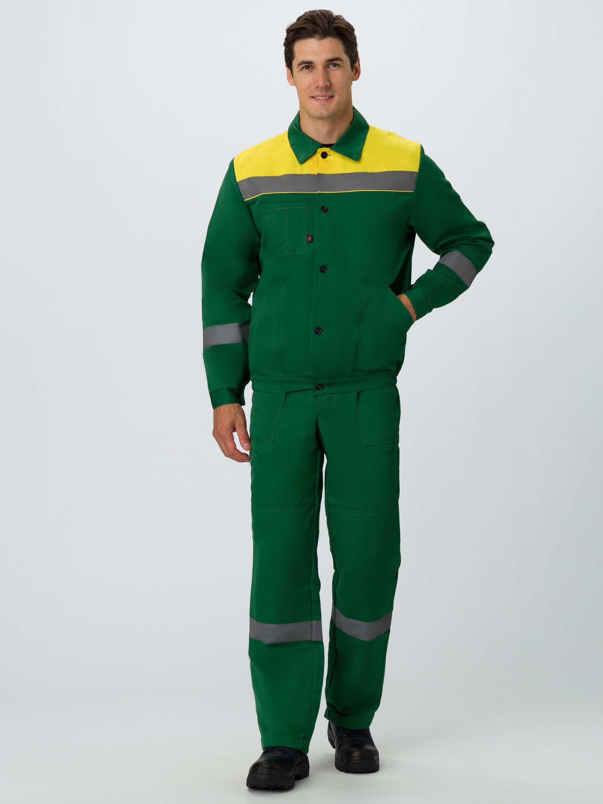 ХИТ ПРОДАЖ! Рабочий костюм «Легион-2 СОП», изготовленный в соответствии с ГОСТ, включает в себя два предмета: рабочая мужская куртка на пуговицах и полукомбинезон рабочий. Спецодежда мужская оснащена широкими светоотражающими полосами для безопасной работы в местах с плохим освещением. Благодаря усилительным накладкам в области колен и локтей, а также усилению плечевого и шагового шва, униформа отличается повышенной надежностью и износостойкостью. Рабочая куртка прямого кроя с регулировкой по объему на поясе не стесняет движения, очень удобна в работе. Для хранения записей предусмотрен нагрудный карман с отделением под ручку. Рабочий полукомбинезон дополняется бретелями с регулировкой по длине и кулиской на резинке, благодаря чему подходит мужчинам разной комплекции. На груди располагается закрывающийся на липучку карман, гульфик застегивается на пуговицы.