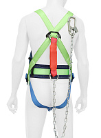 Страховочная система с наплечными и набедренными лямками со стропом из металлической цепи с амортизатором.